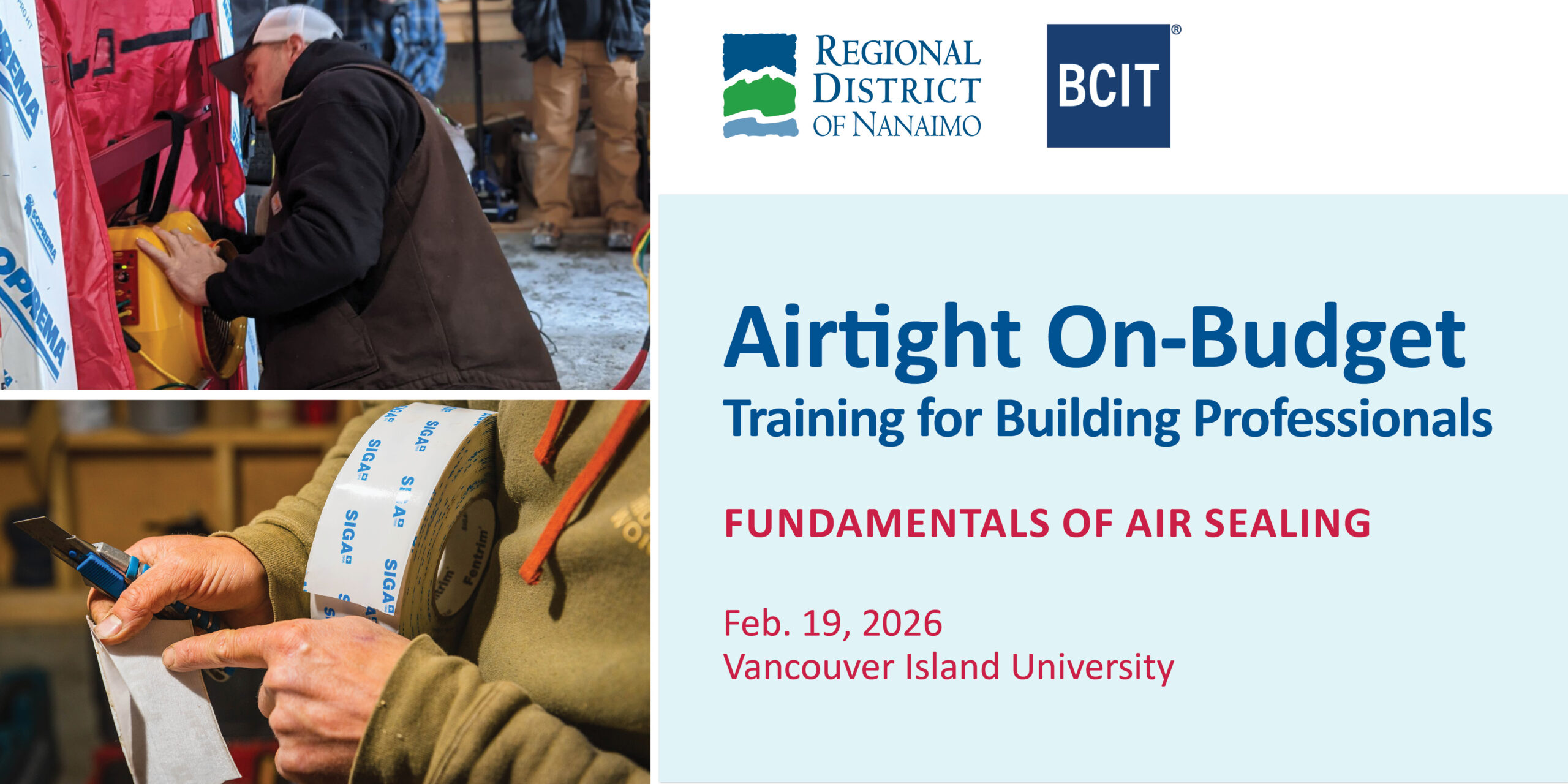 Intro hands-on air sealing workshop for owner-builders and pros, covering air barrier basics, common leaks, and Step Code‑ready practices. Date: Thursday February 19, 2026 Time: 5:30pm-8:00pm Location: Vancouver Island University - Building 108: Windsor Plywood Trades Discovery Centre, room 105 RSVP for Free About This Event This introductory, hands-on workshop provides a practical overview of air sealing fundamentals...