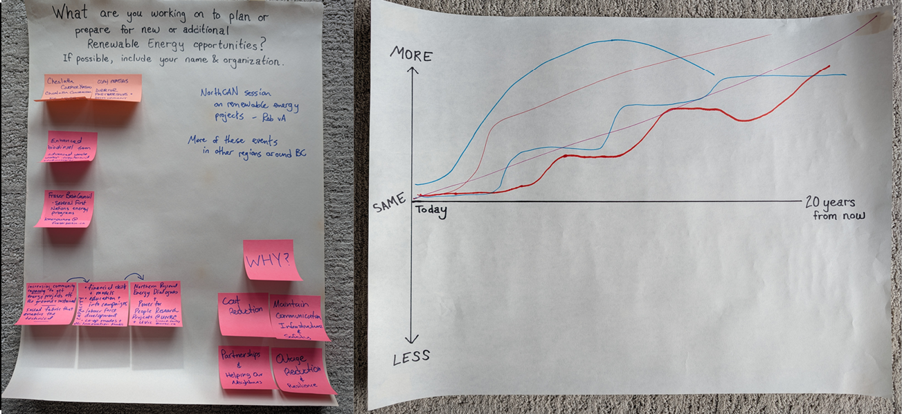 In addition to actual projects, participants contributed information about other planning and preparedness they’re advancing in support of the growth in the regional renewable energy sector. This predicted growth was also reflected in how some participants marked the possible trajectory of renewable energy production in northern BC.